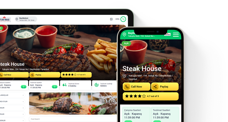 Kendi sipariş web siteniz. Web ve Mobil Sipariş sayfası bir arada. Her ikisinde de sipariş vermek kolay ve hızlı. Sizi teslimat portallarından bağımsız hale getirir ve birçok teslimat hizmetinin rekabetinde işletmenize katkı sağlar.